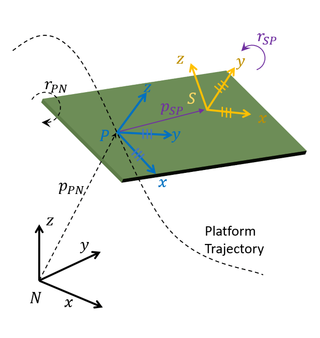 [ вычисляет величины движения кадра датчика относительно кадра навигации (posS,orientS,velS,accS,angvelS] = transformMotion(posSFromP,orientSFromP,posP)posS, orientS, velS, accS, и angvelS) используя положение рамы датчика относительно рамы платформы, posSFromP, ориентация рамы датчика относительно рамы платформы, orientSFromPи положение кадра платформы относительно навигационного кадра, posP. Следует отметить, что положение и ориентация между рамой датчика и рамой платформы считаются фиксированными. Кроме того, предполагается, что неопределенные величины между навигационным кадром и кадром платформы (такие как ориентация, скорость и ускорение) равны нулю.