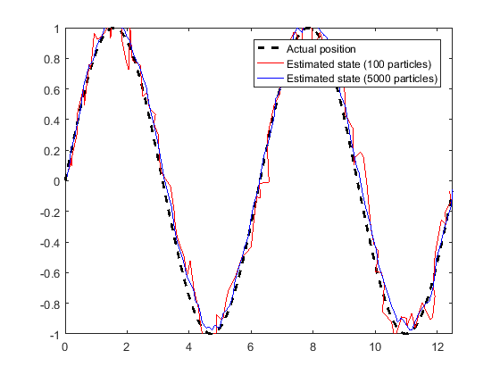 Эти результаты, которые основаны на stateEstimatorPF пример, показать разницу в точности отслеживания при использовании 100 частиц и 5000 частиц.