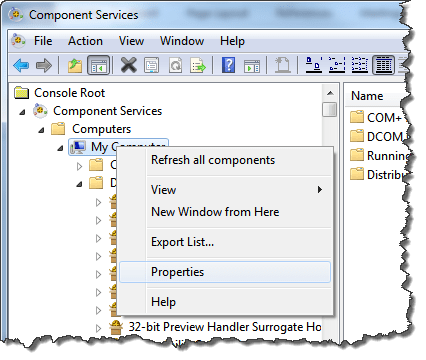 Перейти к Component Services > Computers > My Computer. Щелкните правой кнопкой мыши My Computer и выберите Свойства.