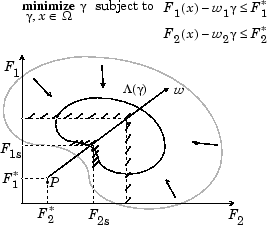 Спецификация целей, *}, определяет точку цели, P. Вектор взвешивания определяет направление поиска от P к возможному функциональному пространству Λ (γ). Во время оптимизации γ изменяется, что изменяет размер возможной области. Границы зависимости сходятся к уникальной точке решения F1s, F2s.