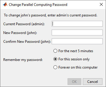 mjs = parcluster('MyMjsProfile'); mjs.Username = 'admin' % Generates prompt for admin user password. changePassword(mjs,'john') % Generates prompt for both passwords.