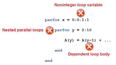 Для решения этих проблем необходимо изменить код для использования parfor. Тело parfor-loop выполняется в параллельном пуле с использованием нескольких работников MATLAB в недетерминированном порядке. Следовательно, вы должны соответствовать этим требованиям для тела parfor-loop: