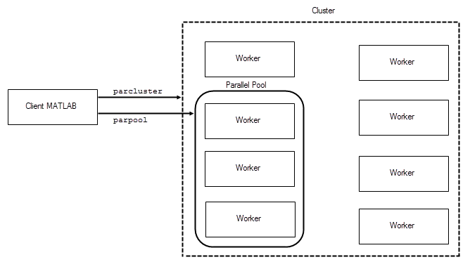 Параллельный пул - это набор работников MATLAB ® на вычислительном кластере или рабочем столе. По умолчанию параллельный пул запускается автоматически при необходимости с помощью параллельных языковых функций, таких какparfor. Можно указать размер пула по умолчанию и кластер в настройках параллельной работы. При выборе параметра «Параллельные настройки» в меню «Параллельный» на панели настроек отображается размер пула и кластер. Размер пула и кластер можно изменить в меню Параллельный (Parallel). Можно также выбрать размер кластера и пула с помощью parcluster и parpool соответственно в командной строке MATLAB. Дополнительные сведения см. на рисунке.