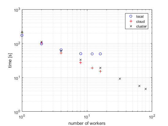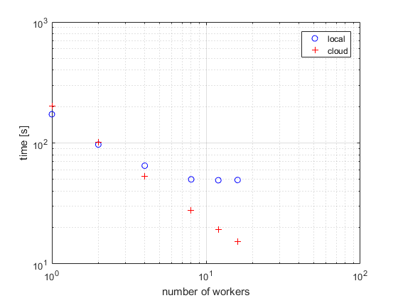 На рисунке показана типичная производительность для работников в облаке (красный плюс точки данных). Этот строгий тест масштабирования показывает линейное ускорение и 100% параллельное масштабирование до 16 работников в облаке. Рассмотрите возможность дальнейшего масштабирования вычислений путем увеличения числа работников в облаке или в вычислительном кластере. Обратите внимание, что параллельная масштабируемость может быть различной в зависимости от оборудования для большего числа сотрудников и других приложений.