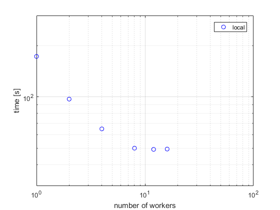 parfor- циклы в кластере и облакеВ этом примере выполняется запуск на локальном многоядерном рабочем столе и измерение времени, необходимого для выполнения вычисления, как функции увеличения числа работников. Тест называется строгим тестом масштабирования. Это позволяет измерить уменьшение времени, необходимого для расчета, при добавлении дополнительных работников. Эта зависимость называется ускорением и позволяет оценить параллельную масштабируемость кода. Затем можно решить, полезно ли увеличивать число сотрудников в параллельном пуле и масштабироваться до кластерных и облачных вычислений.