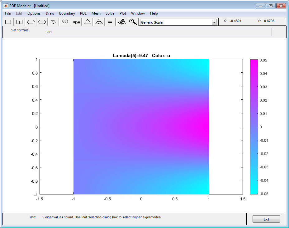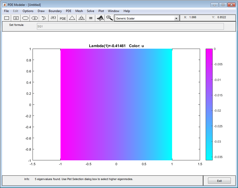 Экспортируйте собственные функции и собственные значения в рабочую область MATLAB с помощью команды Решение (Solve) > Экспортировать решение (Export Solution).