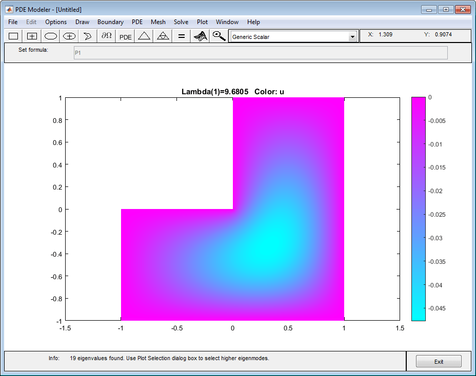 на геометрии Г-образной мембраны. Граничным условием является условие Дирихле u = 0. В этом примере используется приложение PDE Modeler. Программный рабочий процесс см. в разделе Собственные значения и собственные значения Г-образной мембраны.