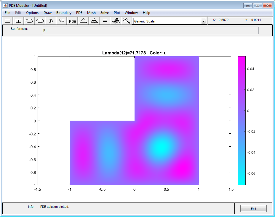 Решите PDE, выбрав Решение (Solve) > Решение PDE (Solve PDE) или нажав кнопку = на панели инструментов. По умолчанию приложение отображает первую собственную функцию.
