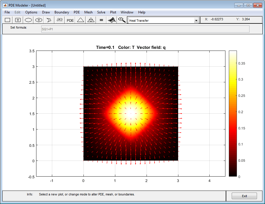 Решите уравнение, выбрав команду Решить (Solve) > Решить PDE (Solve PDE) или нажав кнопку = на панели инструментов.
