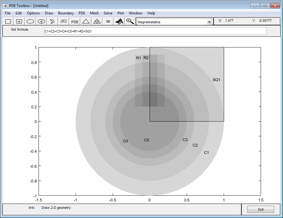 pdecirc(0,0,1,'C1') pdecirc(0,0,0.8,'C2') pdecirc(0,0,0.6,'C3') pdecirc(0,0,0.5,'C4') pdecirc(0,0,0.4,'C5') pderect([-0.2 0.2 0.2 0.9],'R1') pderect([-0.1 0.1 0.2 0.9],'R2') pderect([0 1 0 1],'SQ1')