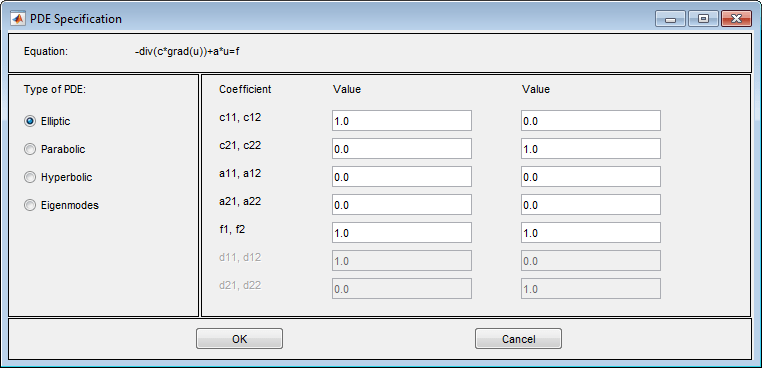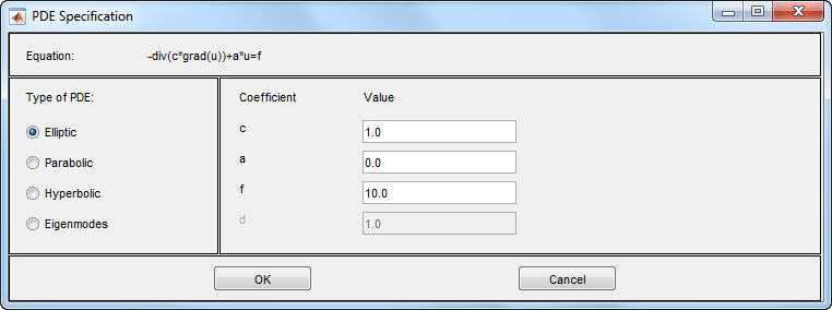 Для ввода коэффициентов для PDE выберите PDE > PDE Specification.