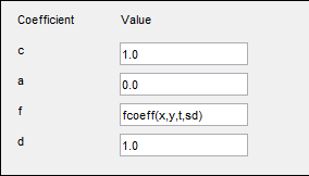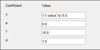 Коэффициент c является матрицей 2 на 2. Можно задать 1-, 2-, 3- или 4-элементные матричные выражения. Разделите выражения для элементов пробелами. Эти выражения означают: