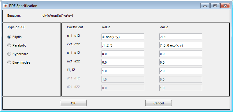 Для систем более высокой размерности не используйте приложение PDE Modeler. Представляйте свои коэффициенты проблем в командной строке.