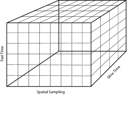 Рассмотрим каждую подматрицу K-by-L куба данных РЛС. Подматрица содержит K векторов строк с размерными 1-by-L. Каждый из этих векторов строк содержит комплексные выборки основной полосы частот из L различных импульсов из одного и того же бина диапазона. Существует матрица K-by-L для каждого из N элементов массива. Интервал дискретизации между L выборками является интервалом повторения импульсов (PRI). Типичные PRIs намного длиннее интервала быстрой выборки. Из-за длинных интервалов дискретизации выборки, взятые через множество импульсов, называются медленным временем.