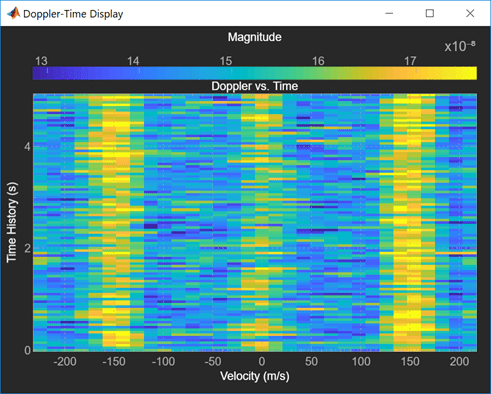 создает объект System области доплеровской интенсивности времени, scope = phased.DTIScopescope. Этот объект отображает интенсивность отклика доплеровского времени входных данных.
