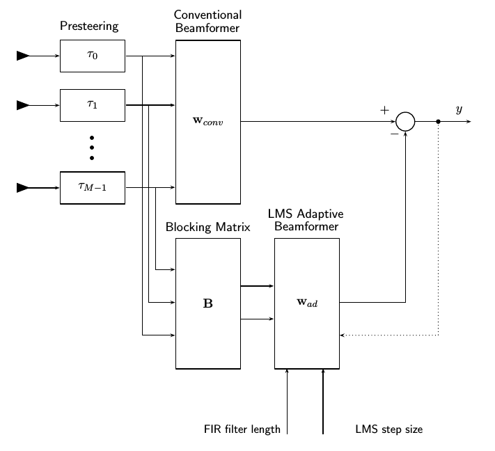 phased.GSCBeamformer Система object™ реализует обобщенный формирователь луча гашения боковых зон (GSC). Формирователь луча GSC разделяет поступающие сигналы на два канала. Один канал проходит через обычный тракт формирователя луча, а второй - в боковой тракт гашения. Алгоритм сначала предварительно направляет матрицу в направлении формирования луча, а затем адаптивно выбирает веса фильтра, чтобы минимизировать мощность на выходе пути гашения боковой зоны. Алгоритм использует наименьшие средние квадраты (LMS) для вычисления адаптивных весов. Конечный сигнал формирования луча представляет собой разность между выходами двух трактов.
