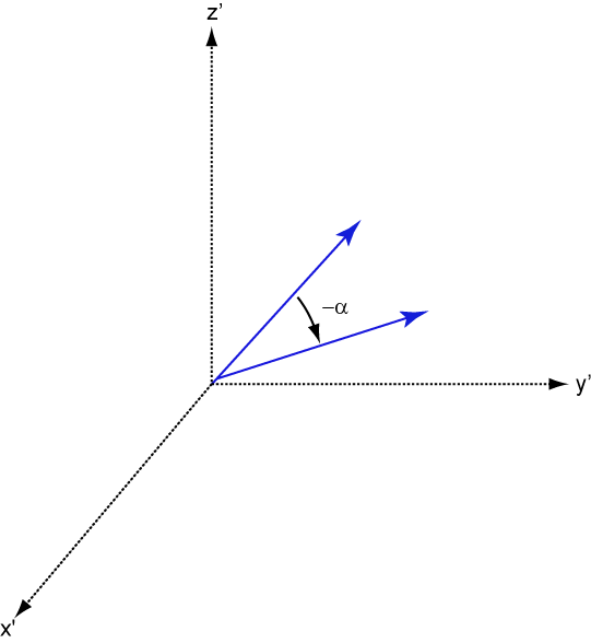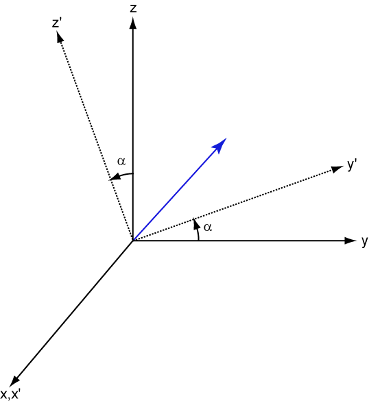 На следующем рисунке показано преобразование вектора при повороте системы координат вокруг оси X. На рисунке ниже показано, как это преобразование можно интерпретировать как вращение вектора в противоположном направлении.