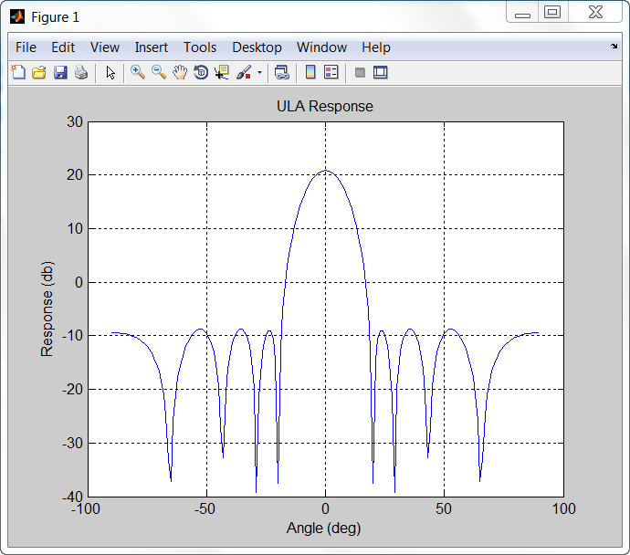 function plot_ULA_response azangles = [-90:90]; elangles = zeros(size(azangles)); fc = 100e9; c = physconst('LightSpeed'); N = size(azangles,2); lambda = c/fc; d = 0.4*lambda; numelements = 11; resp = zeros(1,N); sIso = phased.IsotropicAntennaElement(... 'FrequencyRange',[1,200]*1e9,... 'BackBaffled',false); sULA = phased.ULA('Element',sIso,... 'NumElements',numelements,... 'ElementSpacing',d,... 'Taper',taylorwin(numelements).'); for n = 1:N x = get_ULA_response(sULA,fc,azangles(n),elangles(n)); resp(n) = abs(x); end plot(azangles,20*log10(resp)); title('ULA Response'); xlabel('Angle (deg)'); ylabel('Response (db)'); grid; end function resp = get_ULA_response(sULA,fc,az,el) persistent sAR; c = physconst('LightSpeed'); if isempty(sAR) sAR = phased.ArrayResponse('SensorArray',sULA,... 'PropagationSpeed',c,... 'WeightsInputPort',false,... 'EnablePolarization',false); end resp = step(sAR,fc,[az;el]); end