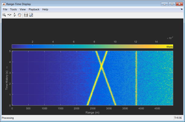dtiscope = phased.IntensityScope('Name','Doppler-Time Display',... 'XLabel','Velocity (m/sec)', ... 'XResolution',dop2speed(DopplerRes,c/fc)/2, ... 'XOffset',dop2speed(-prf/2,c/fc)/2,... 'TimeResolution',0.05,'TimeSpan',5,'IntensityUnits','Mag'); rtiscope = phased.IntensityScope('Name','Range-Time Display',... 'XLabel','Range (m)', ... 'XResolution',c/(2*fs), ... 'TimeResolution',0.05,'TimeSpan',5,'IntensityUnits','Mag');