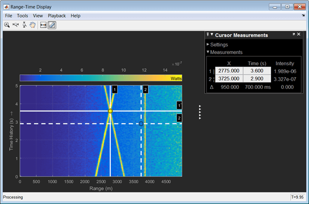 В этом учебном пособии показано, как измерять интенсивность сигналов с помощью пользовательского интерфейса области интенсивности. Сначала создайте область интенсивности. Можно начать с примера ниже, RTI и DTI Displays in Full Radar Simulation или создать собственную область. При запуске этого примера открываются окна времени диапазона (RTI) и времени доплеровского диапазона (DTI). Данное учебное пособие посвящено экрану RTI, поэтому после завершения цикла обработки можно закрыть окно DTI. На этом рисунке показан экран RTI после завершения обработки. На дисплее показаны три дорожки.