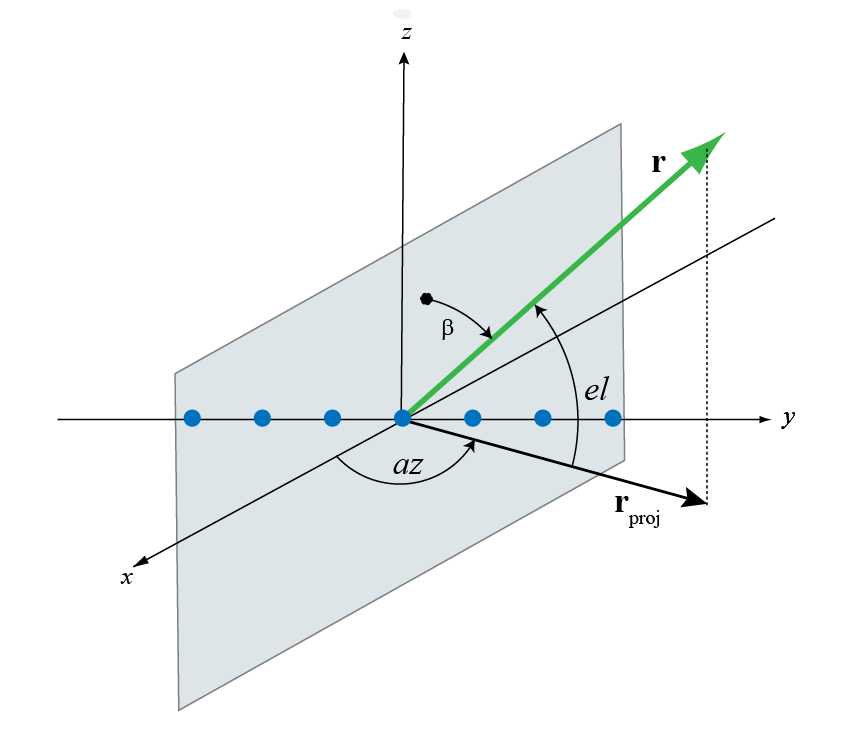 Поскольку пути сигналов для данного широкополосного угла β образуют конус вокруг оси массива, угол возвышения нельзя задать произвольно. Угол возвышения и широкий угол должны удовлетворять