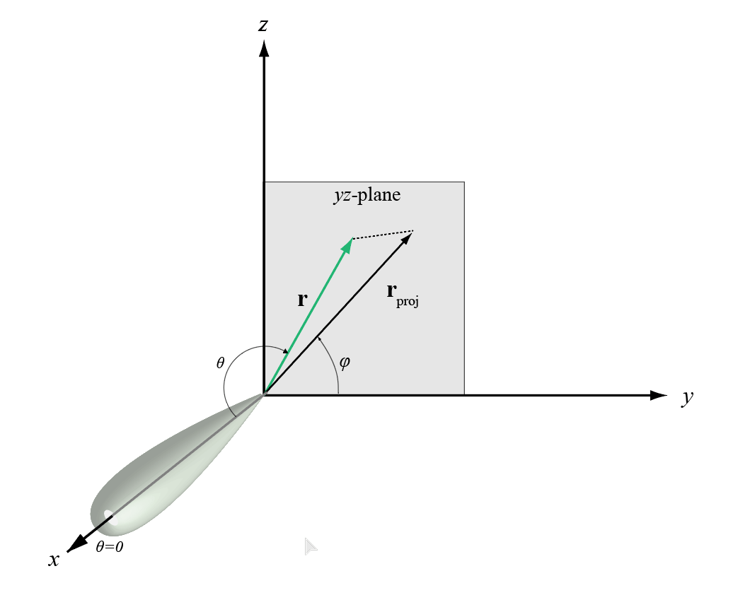Угол фи - это угол от положительной оси y до ортогональной проекции вектора на плоскость yz. Угол положителен к положительной оси Z. Угол фи находится в диапазоне от 0 до 360 градусов. Theta angle (start) - это угол от оси X до самого вектора. Угол положителен к плоскости yz. Угол тета находится в диапазоне от 0 до 180 градусов.