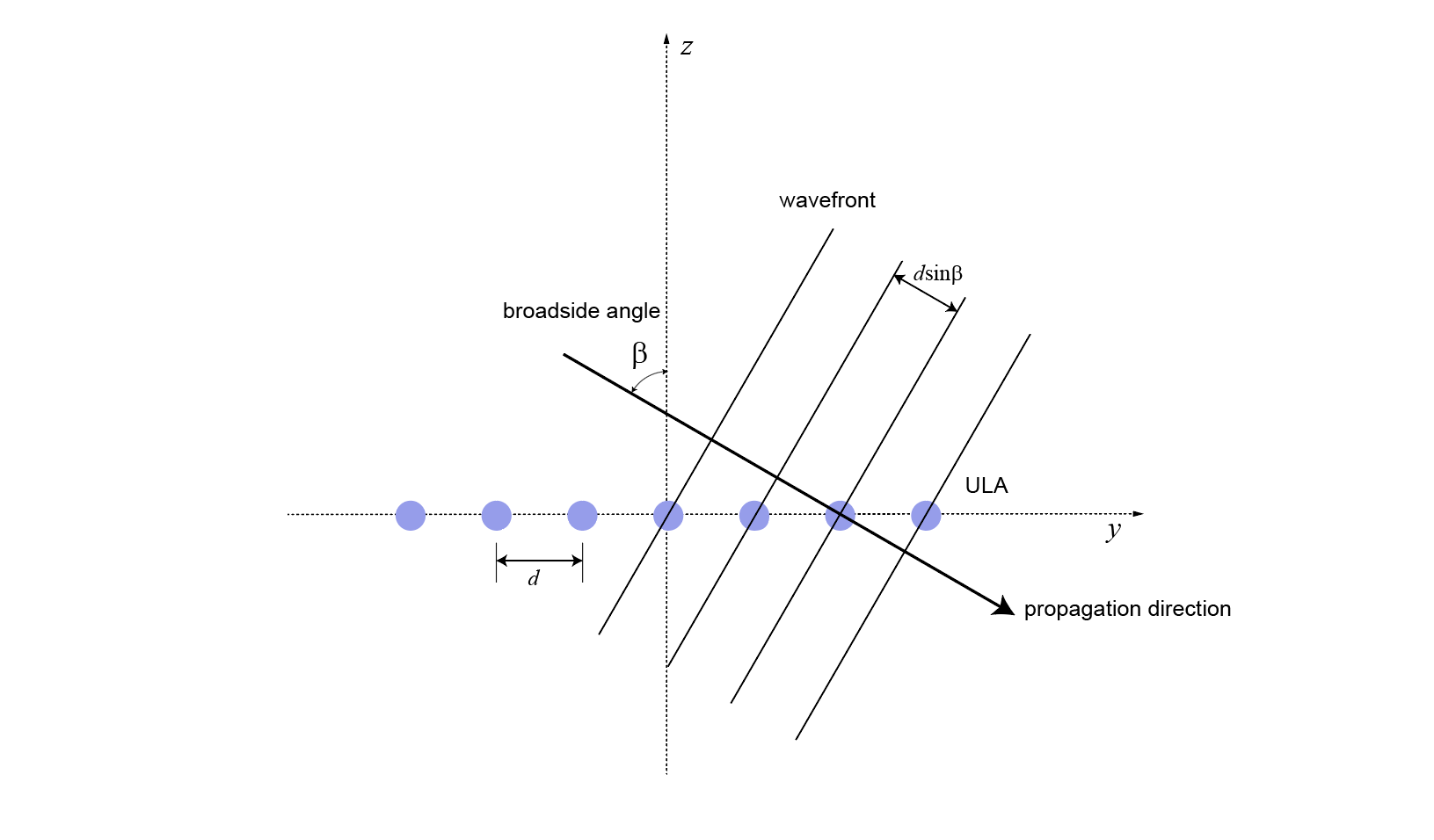 На следующем рисунке показана ULA с элементами, расположенными на расстоянии d метров вдоль оси y. ULA облучается плоской волной, излучаемой точечным источником в дальнем поле. Для удобства угол возвышения равен нулю градусов. В этом случае направление сигнала лежит в плоскости xy. Затем широкополосный угол уменьшается до азимутального угла.