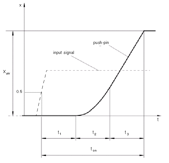 Толкатель приводится в действие, когда значение входного сигнала превышает порог 50% от номинального входного сигнала, где значение номинального сигнала является параметром блока. Движение делится на три фазы, равные по времени: задержка (t1), движение при постоянном ускорении (t2) и движение с постоянной скоростью (t3). Движение останавливается при включении (ton) проходит. В этот момент толкатель достигает заданного значения хода (xstr). Чтобы вернуть толкатель в исходное положение, управляющий сигнал должен пройти через порог 50% номинального входного сигнала, что приводит к отводу толкателя. Движение отвода следует точно тому же профилю, но «растягивается» на время отключения. Время включения и время выключения являются параметрами блока.
