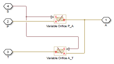 Блок представляет собой составной компонент с двумя блоками переменной диафрагмы, управляемыми одним физическим сигналом. Блок Variable Orifice P_A представляет путь потока P-A. Блок Variable orifice A_T представляет путь потока A-T. Физический сигнал задается через блок порта соединения S.