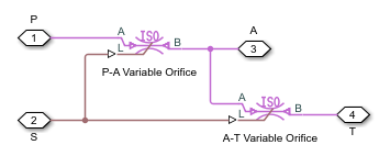 Этот блок представляет собой составной компонент, содержащий два экземпляра блока переменной диафрагмы ISO 6358 (G), соединенного с портами P, A, T и S, как показано ниже. Дополнительные сведения о параметризациях клапанов и расчетах блоков см. в этом блоке (например, те, которые используются для определения массового расхода через порты).