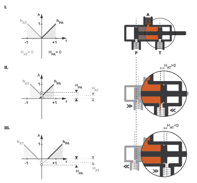 Рабочие положения представляют собой положения, в которые клапан перемещается при максимальном смещении золотника в положительном или отрицательном направлении от нормального положения. Затем одно отверстие обычно закрывается, а другое открывается до полной емкости. Если смещение происходит в отрицательном направлении, отверстие P-A закрывается, а отверстие A-T открывается (положение I на рисунке). Если смещение происходит в положительном направлении, отверстие P-A открыто, а отверстие A-T закрыто (положение II).