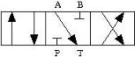 | Отверстие А-Т открыто в нейтральном положении. Отверстия P-B, A-T и B-T перекрываются.