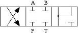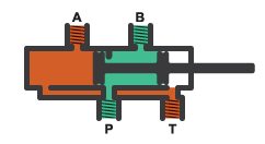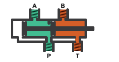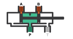 | Отверстия P-A и A-T открыты в нейтральном положении. Отверстия P-B и B-T перекрываются.