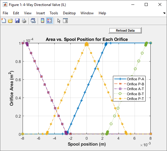 Визуализация показывает, что отверстие P-A открыто между положением катушки в -2.53e-3 и 2.53e-3 М. Из-за спецификации, что отверстие P-A открыто, только когда золотник смещен в положительном направлении, проверка согласованности для нейтрального золотника и положения открытых соединений установлена в Warning возвращает: