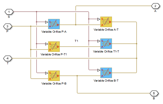 Все блоки управляются одним и тем же сигналом положения, подаваемым через физический сигнальный порт S, но параметр ориентации диафрагмы в экземплярах блоков устанавливается таким образом, что положительный сигнал в порту S открывает отверстия синего цвета на блок-схеме (отверстия P-A, B-T и T1-T) и закрывает отверстия желтого цвета (отверстия A-T, P-B и P-T1). В результате отверстия отверстий вычисляются следующим образом:
