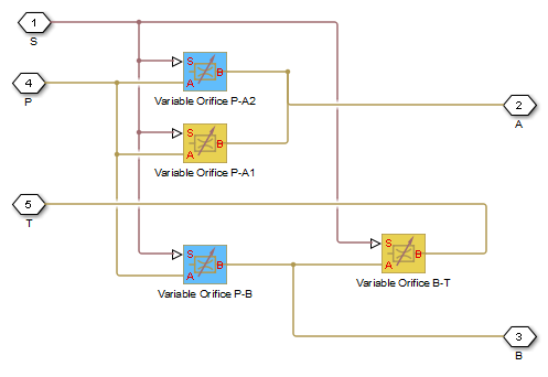 Все блоки регулируемой диафрагмы управляются одним и тем же сигналом положения, подаваемым через физический сигнальный порт S, но параметр ориентации диафрагмы в экземплярах блоков устанавливается таким образом, что положительный сигнал в порту S открывает отверстия синего цвета на блок-схеме (отверстия P-A2 и P-B) и закрывает отверстия желтого цвета (отверстия P-A1 и B-T). В результате отверстия отверстий вычисляются следующим образом: