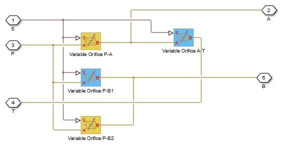 Все блоки регулируемой диафрагмы управляются одним и тем же сигналом положения, подаваемым через физический сигнальный порт S, но параметр ориентации диафрагмы в экземплярах блоков устанавливается таким образом, что положительный сигнал в порту S открывает отверстия синего цвета на блок-схеме (отверстия P-B1 и A-T) и закрывает отверстия желтого цвета (отверстия P-A и P-B2). В результате отверстия отверстий вычисляются следующим образом: