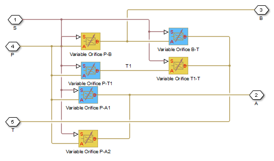 Все блоки регулируемой диафрагмы управляются одним и тем же сигналом положения, подаваемым через физический сигнальный порт S, но параметр ориентации диафрагмы в экземплярах блоков устанавливается таким образом, что положительный сигнал в порту S открывает отверстия синего цвета на блок-схеме (отверстия P-A1, P-T1 и B-T) и закрывает отверстия желтого цвета (отверстия P-A2, P-B и T1-T). В результате отверстия отверстий вычисляются следующим образом:
