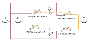 Блок 4-Way направленного клапана моделирует поток через направленный регулирующий клапан с четырьмя портами (P, T, A и B) и четырьмя путями потока (P-A, P-B, A-T и B-T). В типичной системе порты соединяются с насосом (P), резервуаром (T) и приводом двойного действия (A и B). Каждый из путей содержит переменное отверстие, которое масштабируется пропорционально перемещению управляющего элемента - часто шарика, золотника или диафрагмы, связанной с сигналом в канале S. Этот клапан служит переключателем, посредством которого распределяет поток между плечами четырехзаходного соединения.