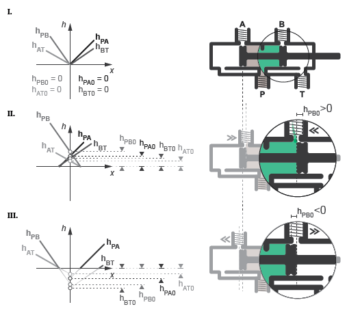 Рабочие положения показаны на рисунке в случае клапана по умолчанию без смещения открытия. Одно, обозначенное как I, соответствует отверстиям P-A и B-T, которые являются максимально открытыми, и отверстиям P-B и A-T, которые являются максимально закрытыми. Другая, обозначенная II, соответствует обратной компоновке, причем отверстия Р-В и А-Т являются максимально открытыми, а отверстия Р-А и В-Т - максимально закрытыми. В точках между нормальным и рабочим положениями одно отверстие частично открыто, а другое полностью закрыто. Следует отметить, что ни между портами A и B, ни между портами P и T не существует соединения и что поток через них не может развиваться.