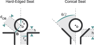 Блок шарового клапана моделирует отверстие с переменной площадью отверстия, управляемой скользящим шаровым механизмом. Площадь открытия изменяется в зависимости от относительного положения шарика - подъемника клапана. Смещение к отверстию уменьшает поток, в то время как смещение от отверстия увеличивает поток. Интерфейс между отверстием и шариком - седлом клапана - может бытьSharp-edged, показанный слева на рисунке, или Conical, показано справа.