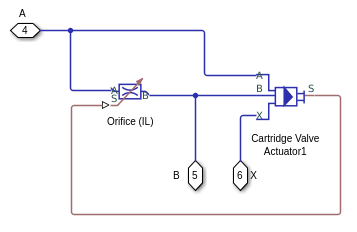 Блок вставки клапана картриджа (IL) моделирует клапан управления потоком картриджа в изотермической жидкостной сети. Седло клапана может быть определено как коническое или как пользовательское отверстие, параметризованное аналитическими или табличными составами. Клапан открывается, когда комбинированное давление в портах A и B превышает силу предварительной нагрузки пружины и давление в порту X.