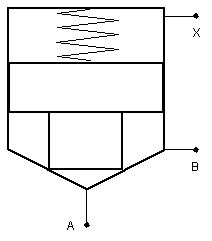 Вставка патронного клапана с коническим седлом представляет собой вставку гидравлического патронного клапана, состоящего из тарельчатого клапана, взаимодействующего с коническим седлом. Положение тарельчатого клапана определяется давлением в отверстиях А, В и Х и силой пружины. Принципиальная схема вставки патронного клапана с коническим седлом показана на следующей иллюстрации.