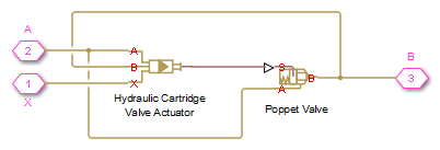 Соединения A, B и X являются гидравлическими консервационными отверстиями, связанными с входом клапана, выходом клапана и клеммой управления клапаном соответственно. Положительное направление блока - от порта A к порту B. Давление в канале X действует для закрытия клапана, в то время как давление в канале A и канале B действует для открытия отверстия.