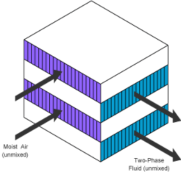 Например, для достижения двухпроходной конфигурации на стороне двухфазной текучей среды и однопроходной конфигурации на стороне влажного воздуха можно соединить последовательно двухфазные стороны текучей среды и стороны влажного воздуха с одним и тем же входом параллельно. (например, два блока источника массового расхода с половиной общего массового расхода), как показано ниже.