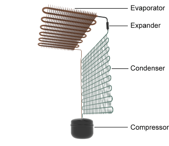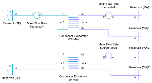 Конденсаторный испаритель (2P-MA) моделирует теплообменник с одной сетью влажного воздуха, которая протекает между портами A2 и B2, и одной двухфазной сетью текучей среды, которая протекает между портами A1 и B1. Теплообменник может действовать как конденсатор или как испаритель. Потоки текучей среды могут быть выровнены параллельно, встречно или поперечно.