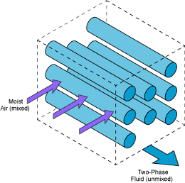 Предполагается, что конденсат не накапливается на поверхности теплопередачи и не влияет на геометрические параметры, такие как диаметр трубы. Предполагается, что конденсированная вода полностью удаляется из потока влажного воздуха, расположенного ниже по потоку.