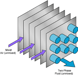На стороне влажного воздуха на поверхности теплопередачи может образовываться слой конденсации. Этот жидкий слой может влиять на количество тепла, передаваемого между влажным воздухом и двухфазной жидкостью. Уравнения теплопередачи E-NTU приведены выше для сухой теплопередачи. Для коррекции влияния конденсации дополнительно рассчитываются уравнения E-NTU с приведенными ниже влажными параметрами. Какой из двух расчетных расходов тепла приводит к большему количеству охлаждения стороны влажного воздуха, используется в тепловых расчетах для каждой зоны [1]. Для использования этого метода предполагается, что число Льюиса близко к 1 [1], что верно для влажного воздуха.