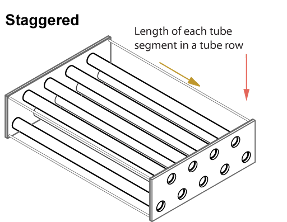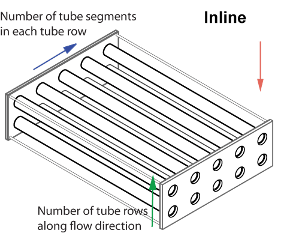 Если для геометрии потока задано значение Flow perpendicular to bank of circular tubes, используйте параметр расположения сетки банка трубок, чтобы определить двухфазное выравнивание пучка трубок текучей среды как Inline или Staggered. Красная стрелка, направленная вниз, указывает направление потока влажного воздуха. На рисунке Inline также указаны Количество рядов труб вдоль направления потока и Количество сегментов труб в параметрах каждого ряда труб. Здесь направление потока относится к потоку влажного воздуха, а труба относится к двухфазной трубе для текучей среды. Параметр Длина каждого сегмента трубы в ряду труб показан на рисунке в шахматном порядке.