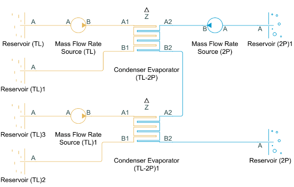 Конденсаторный испаритель (TL-MA) моделирует теплообменник с одной тепловой жидкостной сетью, которая протекает между портами A1 и B1, и одной двухфазной жидкостной сетью, которая протекает между портами A2 и B2. Теплообменник может действовать как конденсатор или как испаритель. Потоки текучей среды могут быть выровнены параллельно, встречно или поперечно.